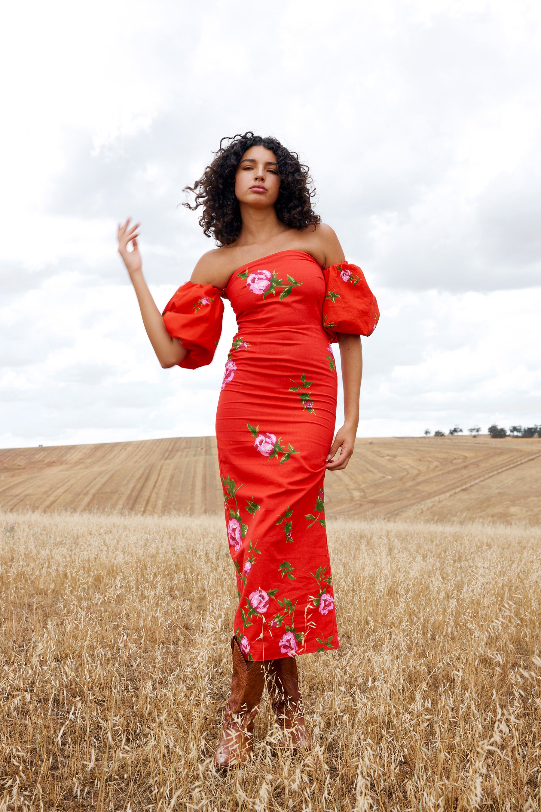 This stunning off-the-shoulder dress exudes effortless femininity with its figure-hugging silhouette and bold red hue. The romantic puffed sleeves add a touch of drama, while delicate pink floral prints enhance the design’s charm. Perfect for special occasions, this dress pairs beautifully with boots for a modern, rustic edge.