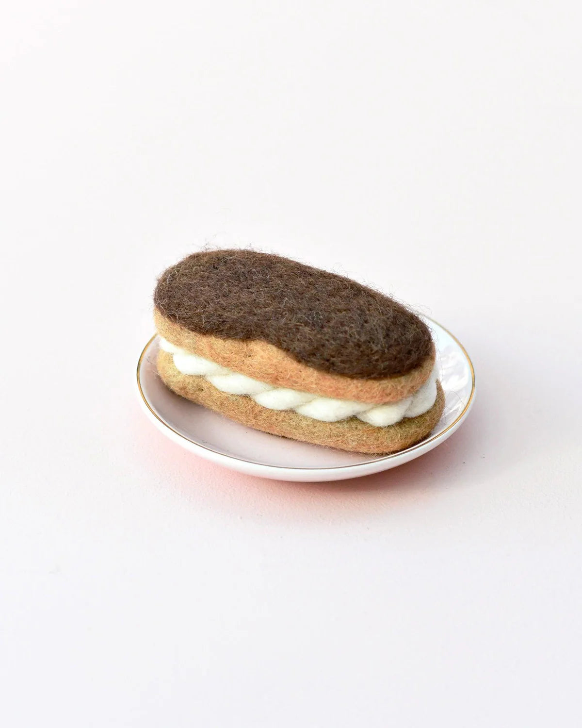 Each chocolate eclair has been meticulously needle-felted with dense wool that has been dyed with non-toxic colours, making it safe for play.