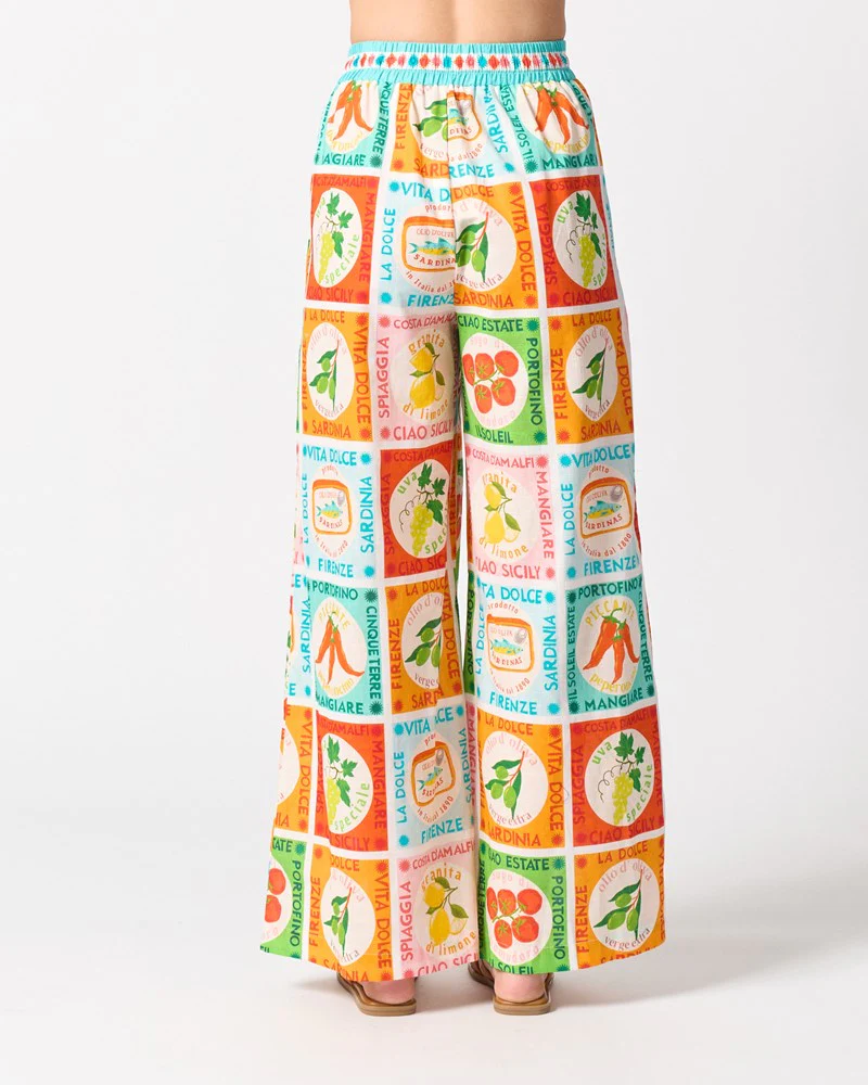 Vibrant and full of personality, the Vermont Pant in our exclusive Ciao Sicily print is your new summer statement. Designed with a relaxed wide-leg fit, these high-waisted pants feature an elasticated waistband and contrast rope drawcord for comfort and ease. Lightweight with a soft drape, they’re perfect for sunny days, whether you're exploring the coast or heading out to lunch.